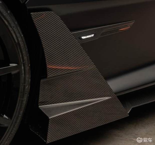 车身侧面,设计师在后翼子板进气口上方添加了一些空力附件,能更好的为V12发动机带来新鲜空气,车门上也布置了拥有MANSORY标志的小配件,下方是带有风刀的侧裙。