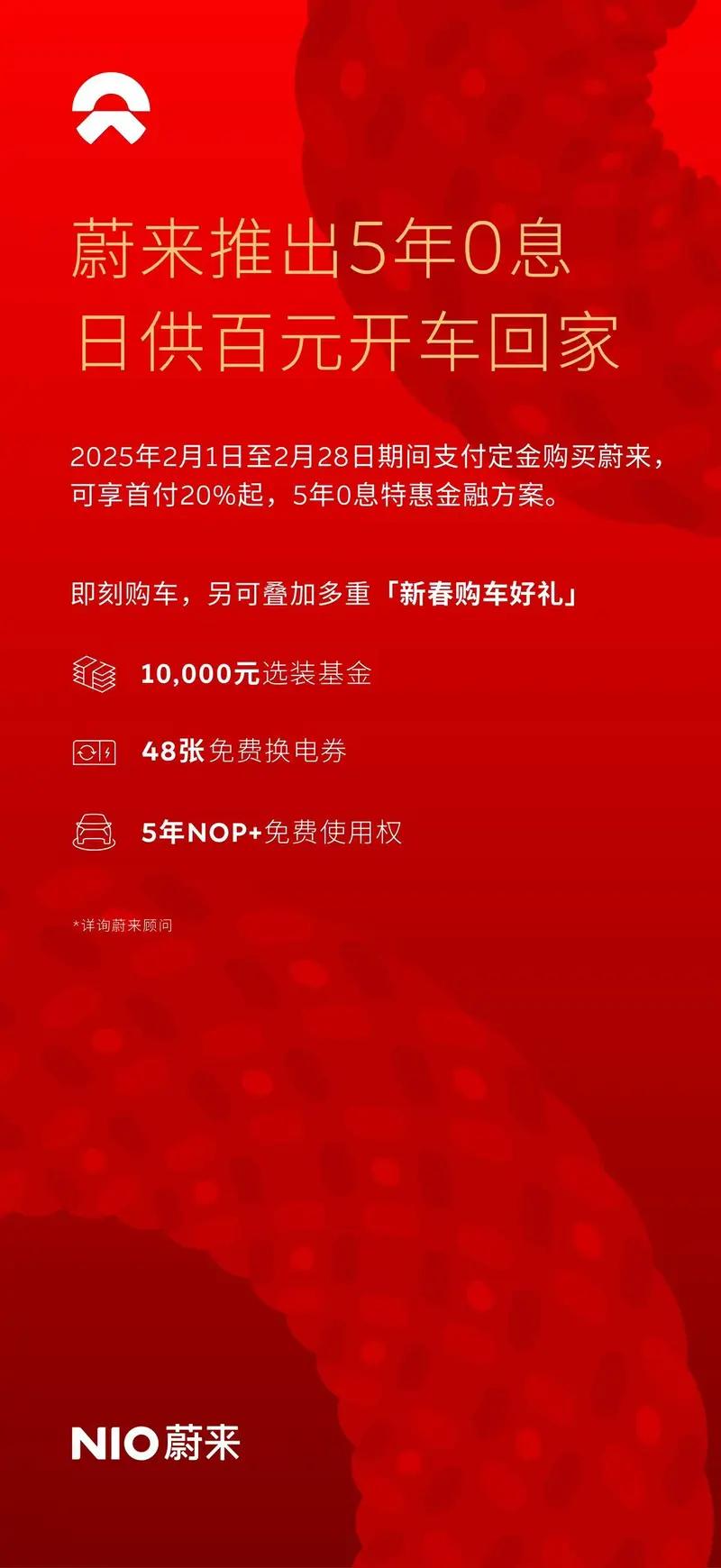 节日期间,蔚来在牛屋为用户朋友们准备了儿童拜年红包、新春全家福、新春观影会等新春活动,欢迎大家和亲友一起到店感受年味儿。2025年2月1日至2月28日期间支付定金购买蔚来,可享5年0息特惠金融方案,还可叠加万元选装基金、免费换电券等新春购车礼遇,欢迎垂询。