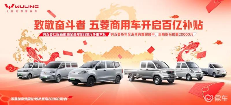 | 五菱商用车 | 货车家族产品\红标新能源 | 货车家族产品享购置税减半、至高综合优惠20000元;红标新能源享至高8888元多重大礼,包括至高5000元置换补贴及3888元专属服务礼包,还可叠加享受至高20000元国家/地方补贴 |