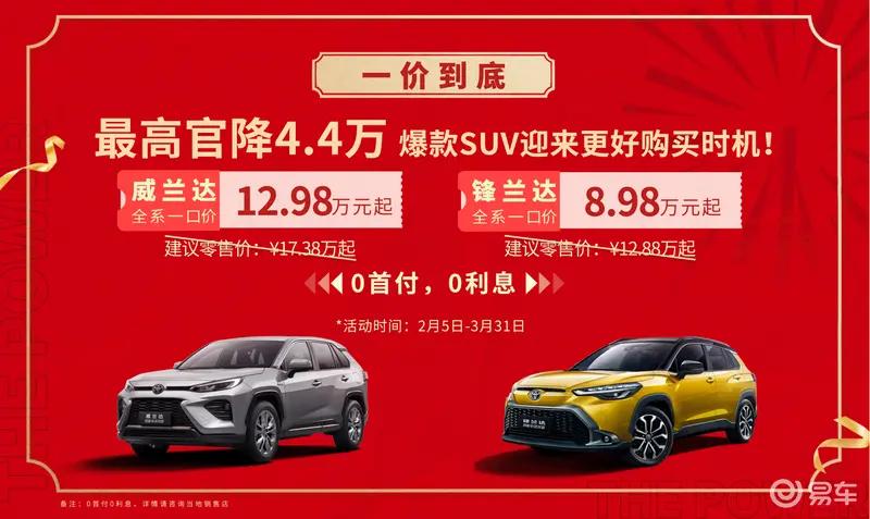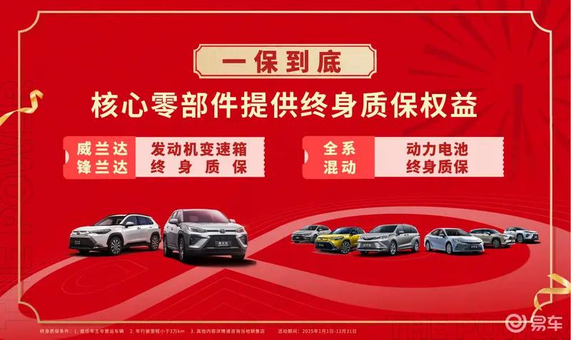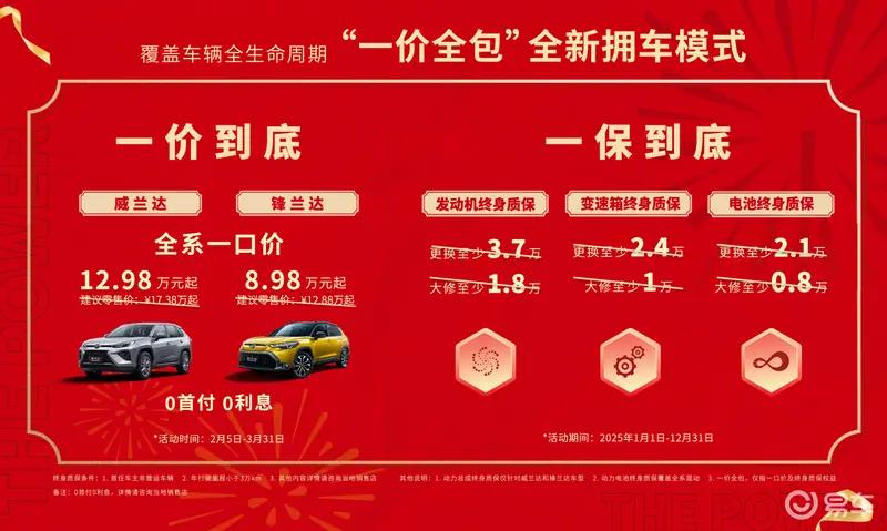 2月5日,广汽丰田宣布推出一口价暨终身质保。针对爆款车型威兰达和锋兰达实施“一口价”,厂家指导价降幅最高达4.4万元,并提供“三大核心部件终身质保”权益。