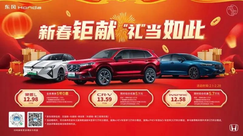 2月5日,东风本田官方宣布2月1日至2月28日,购买灵悉L、CR-V、英仕派三大车型,可享受限时超值福利。购买灵悉L全系可享受5年0息、0首付年利率低至1.99%、厂端置换补贴至高0.4万元、复购即享至高20万积分(价值2000元)。