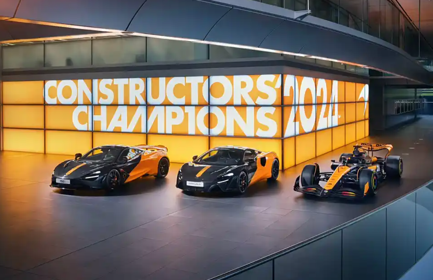 比如驾驶座一侧有加长的碳纤维门槛,上面有Lando Norris和Oscar Piastri的亲笔签名。除此之外,还嵌有源自MCL38 F1赛车的碳纤维车身部件、定制赛道成绩铭牌等等,来展示MCL38 F1赛车在2024赛季取得的成绩和圈速等等。