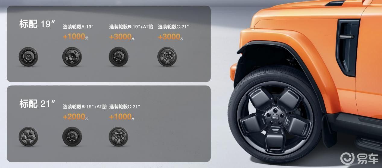 同时推出专为两驱版车型打造的19吋五幅轮毂,以及专为四驱版车型升级的19吋复古越野轮毂(配AT胎)和适合自行DIY的21吋分色五幅轮毂三种全新组合。官方App的3D可视化选装系统让用户“所见即所得”,实时预览轮眉、中网及各种不同轮毂组合的前装搭配效果。