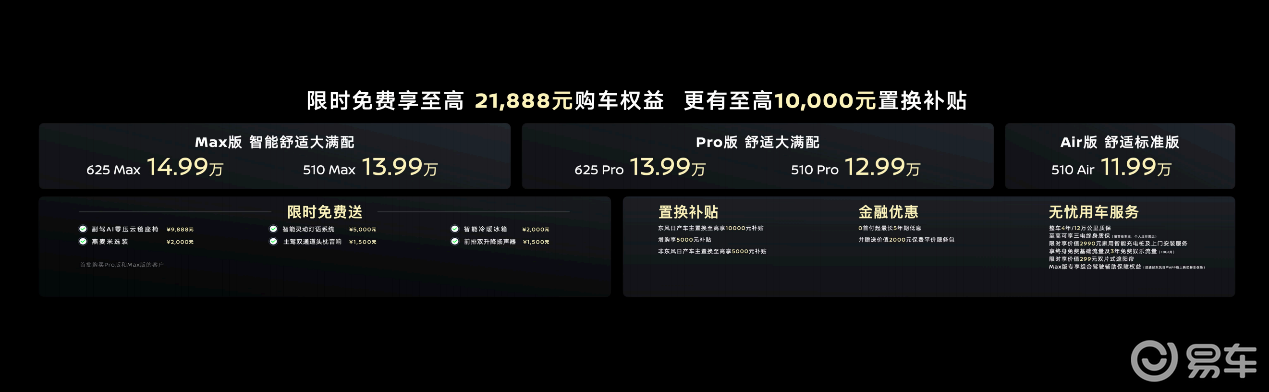 不仅如此,对于首批购买Pro版和Max版的用户,东风日产限时送出至高21888元的购车权益,包括副驾AI零压云毯座椅,科技选装包(智能灵动灯语系统、主驾双通道头枕音响、前排双升降扬声器),智能冷暖冰箱,以及燕麦米灵感车色。此外,东风日产还发布了诚意满满的购车权益,包括至高10000元置换补贴、0首付起最长5年期低息金融优惠、以及涵盖质保、充电、用车等方面的无忧用车服务,具体权益和政策可咨询东风日产当地专营店。