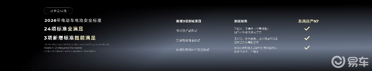 N7的超安全笼式车身,成功挑战行业首个巴音布鲁克翻滚挑战。搭载行业首个四针刺多电芯无热蔓延超安全电池,历经146项超高标准电池保障测试。根据2026年的新国标,N7的电池不仅24项标准测试全部达标,更提前满足了热扩散、底部撞击、快充循环后安全测试3项新增标准!