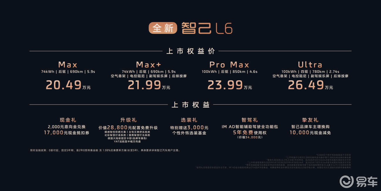 全新智己L6推出四大配置版本,官方指导价21.99万元~27.99万元;限时上市权益价格分别为: