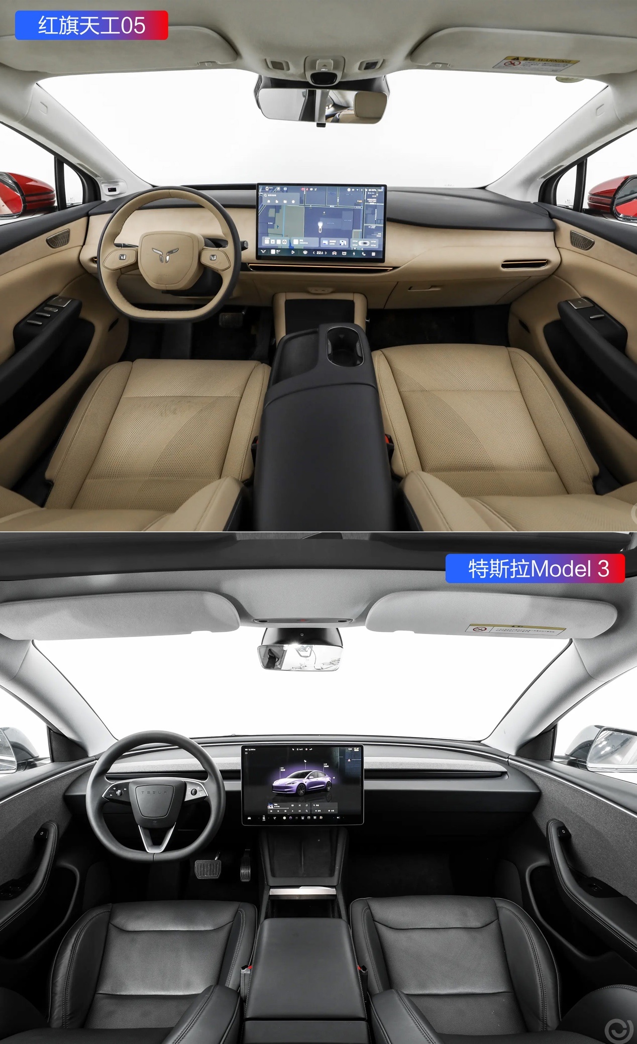红旗天工05的内饰遵循“天工开物”理念,车内融入中国传统纹样元素,细节之处尽显国潮美学。同时,红旗天工05还在车内大量运用了环保材质,健康指数几乎直达满级,高级皮质的运用还让内饰整体的触感非常舒适。而特斯拉Model 3 内饰依旧是以“极简化”为核心,整体主打简约风,细节之处的设计则没有红旗天工05看起来有特点、有新意。