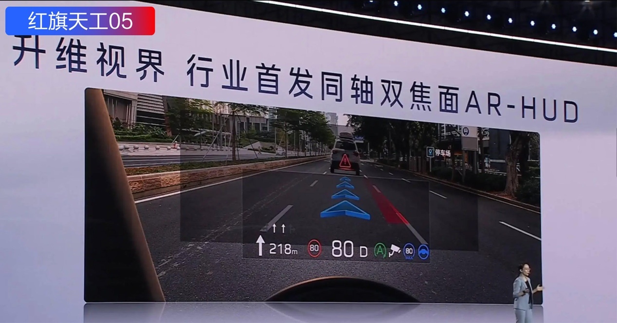 65英寸的AR-HUD抬头显示则是红旗天工05配置上的另一大亮点,AR-HUD由泽景电子打造,为首款量产Deep Scenes AR-HUD。Deep Scenes用智能算法整合不同视觉空间信息,将虚拟与现实无缝对接。该AR-HUD采用独特的双焦面技术,近视觉空间2-4米,远视空间7-10 米,可以显示车速和续航等信息,还可以将导航、智驾等信息拟合到前方路面,现出逼真的3D效果,并支持障碍物提示,预估距离显示等,可以在最大限度上减少驾驶员低头操作所带来隐形的行车风险。