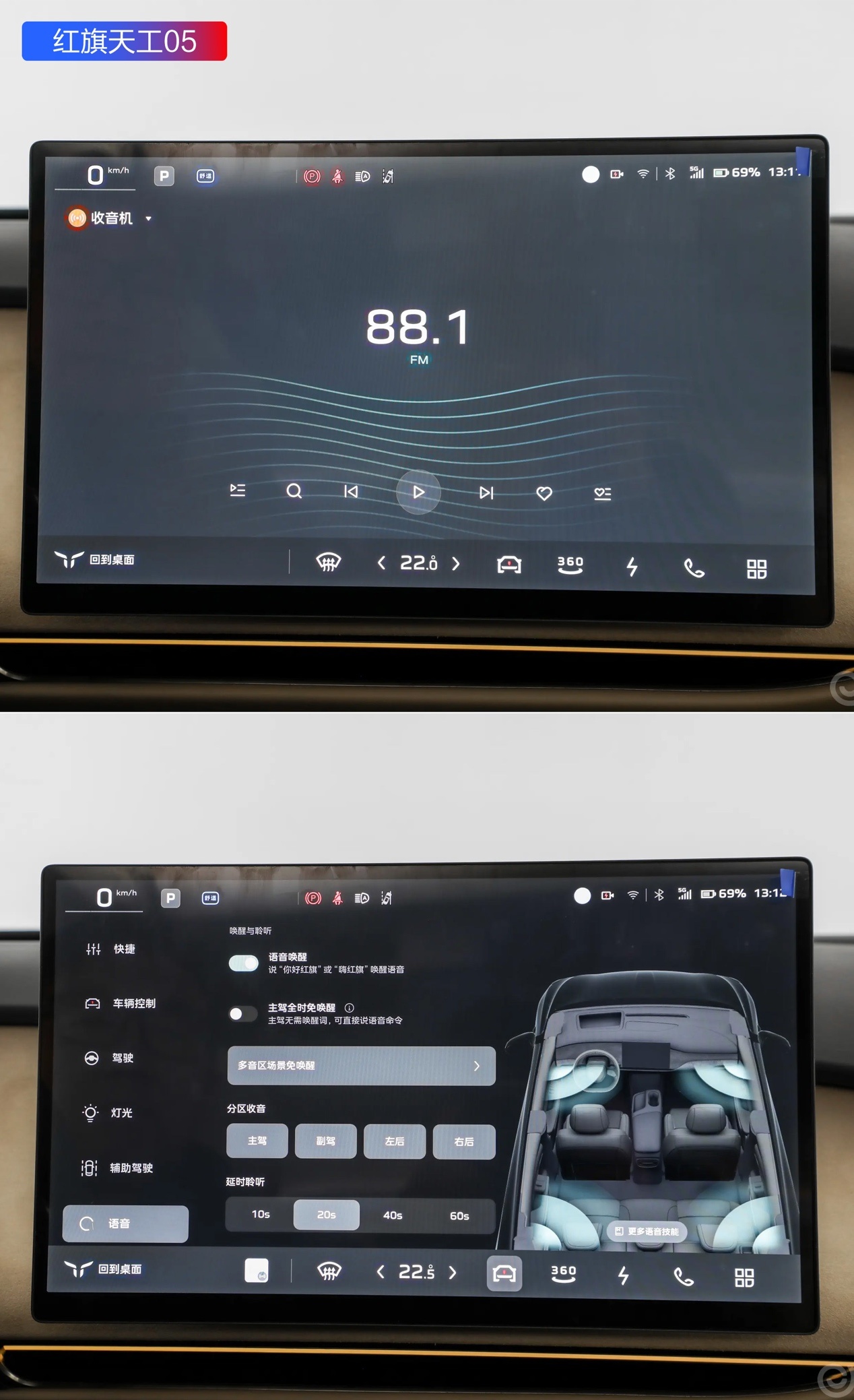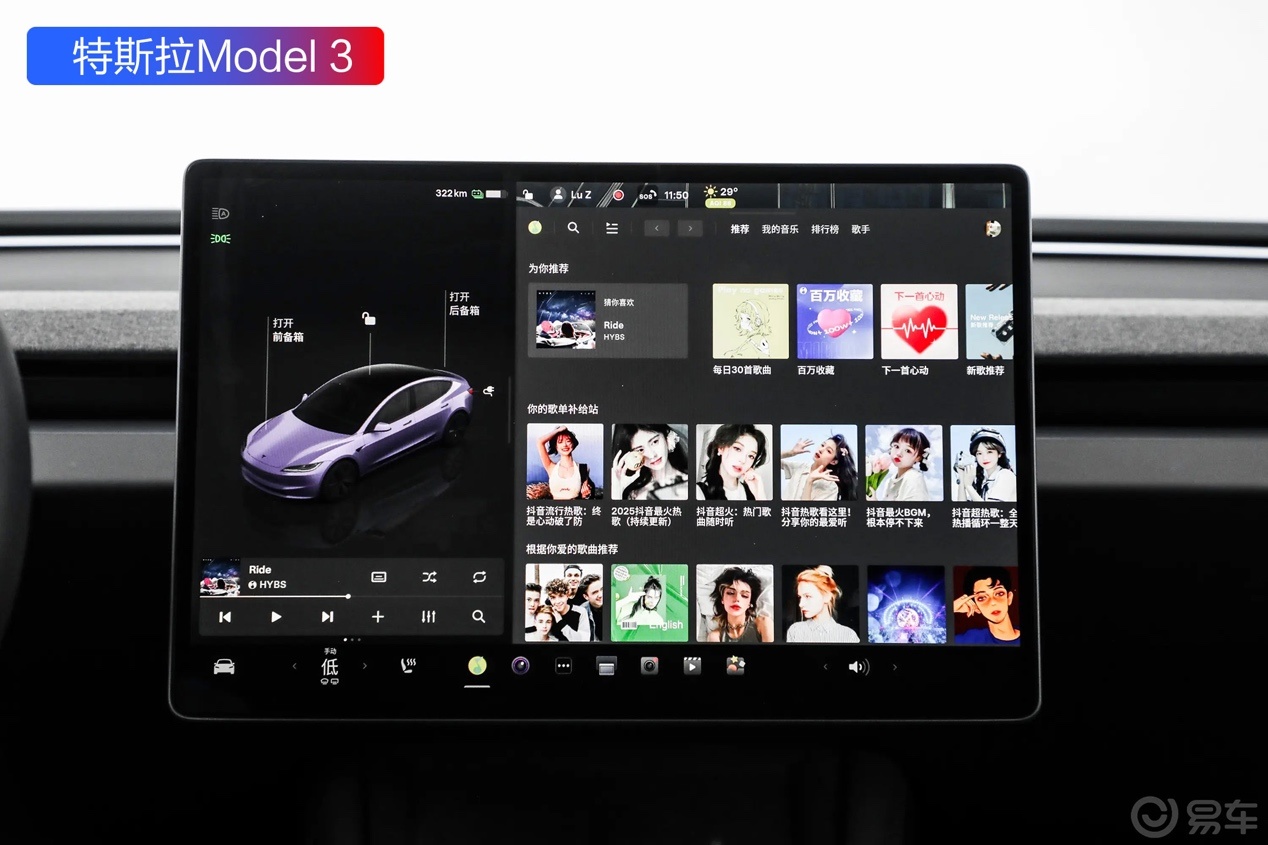 特斯拉Model 3则标配了一块尺寸为15.4英寸的中控屏,分辨率为1920x1080,画质上没有红旗天工05上那块2.5K屏高清。车内所有的功能几乎都集成在这块屏幕内,车机界面简洁,交互逻辑清晰,但是功能性上没有红旗天工05丰富,语音助手仅支持单音区指令,且不支持连续语音识别这种进阶功能,使用场景存在一定限制。并且车机采用封闭生态,仅支持特斯拉自家或少数适配软件,娱乐性相对较弱。